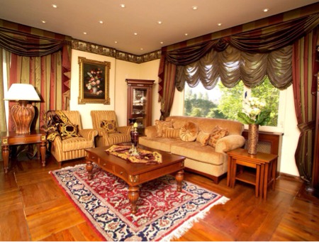 Traditional style should feel classy, yet comfortable. You can tell that this room isn't exactly modern in idea, and yet it fits in today's world . Everything is symmetrical , there is a lot of upholstered furniture, and the patterned rug is a very common attribute to these rooms.
