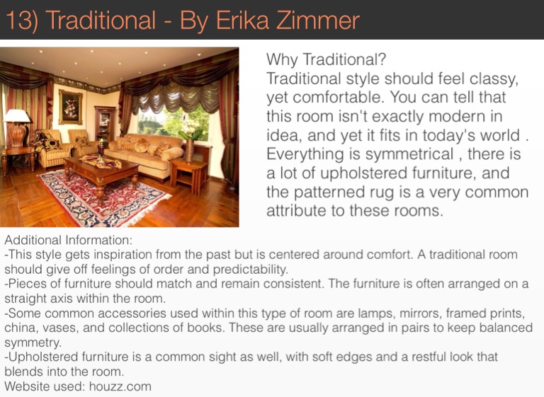 -This style gets inspiration from the past but is centered around comfort. A traditional room should give off feelings of order and predictability.