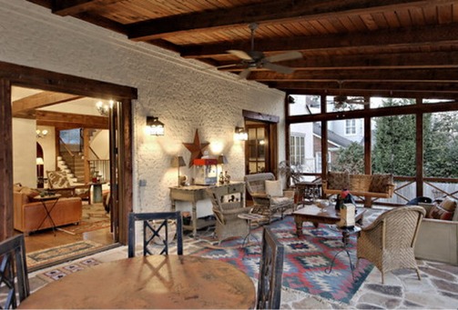 Throughout this room you can sense the Native American/Spanish feel. You can see this on the patterned rug on the floor, the patterns on the pillows, the southern looking star on the wall, and in all the furniture.