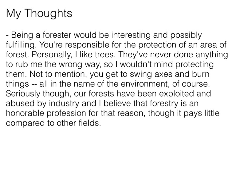 - Being a forester would be interesting and possibly fulfilling. You're responsible for the protection of an area of forest. Personally, I like trees. They've never done anything to rub me the wrong way, so I wouldn't mind protecting them. Not to mention, you get to swing axes and burn things -- all in the name of the environment, of course. Seriously though, our forests have been exploited and abused by industry and I believe that forestry is an honorable profession for that reason, though it pays little compared to other fields.