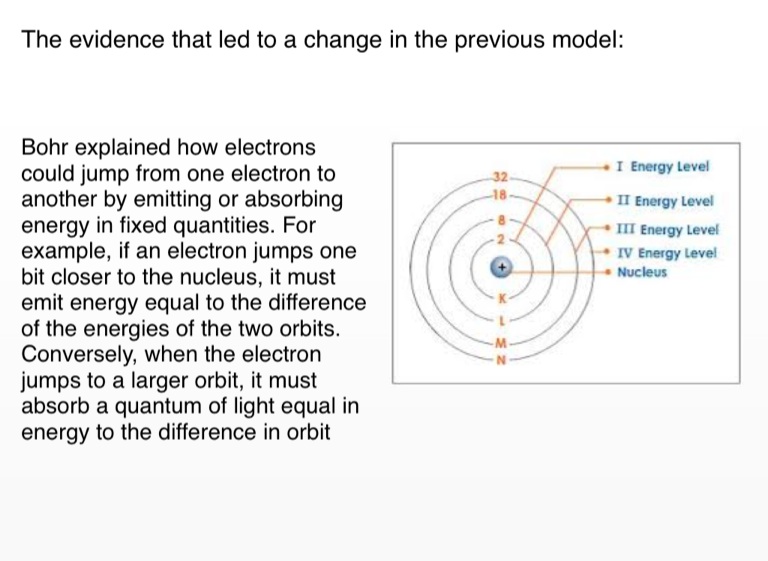 Bohr explained how electrons could jump from one electron to another by emitting or absorbing energy in fixed quantities. For example, if an electron jumps one bit closer to the nucleus, it must emit energy equal to the difference of the energies of the two orbits. Conversely, when the electron jumps to a larger orbit, it must absorb a quantum of light equal in energy to the difference in orbit