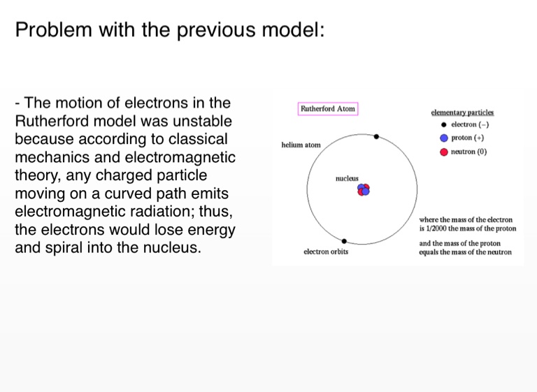 - The motion of electrons in the Rutherford model was unstable because according to classical mechanics and electromagnetic theory, any charged particle moving on a curved path emits electromagnetic radiation; thus, the electrons would lose energy and spiral into the nucleus.