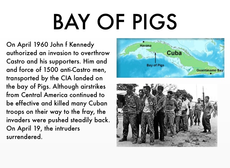 On April 1960 John f Kennedy authorized an invasion to overthrow Castro and his supporters. Him and and force of 1500 anti-Castro men, transported by the CIA landed on the bay of Pigs. Although airstrikes from Central America continued to be effective and killed many Cuban troops on their way to the fray, the invaders were pushed steadily back. On April 19, the intruders surrendered.