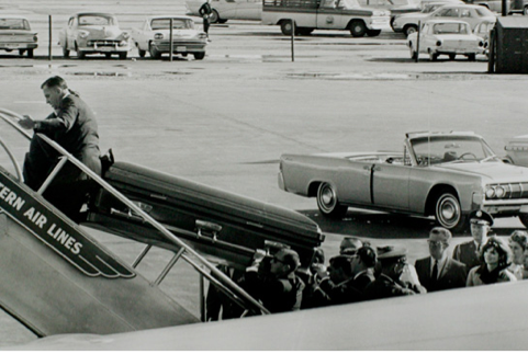 The casket is lifted (with much struggle they had to the take the handles off it just so it would fit through the small door) onto Air Force One