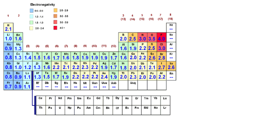 Electronegativity is a measure of the ability of an atom or molecule to attract pairs of electrons in the context of a chemical bond. The type of bond formed is largely determined by the difference in electronegativity between the atoms involved, using the Pauling scale. Trend-wise, as one moves from left to right across a period in the periodic table, the electronegativity increases due to the stronger attraction that the atoms obtain as the nuclear charge increases. Moving down in a group, the electronegativity decreases due to the longer distance between the nucleus and the valence electron shell.