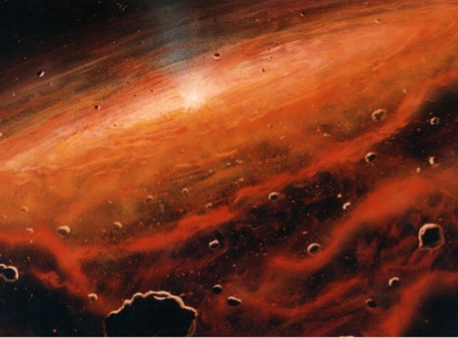 The first part of this theory says that the solar system started out as only dust and gasses. This is called a solar nebula. The solar nebula started spinning because gravity collapsed on it. This lead to the creation of the sun. Leftover materials clumped together while solar wind blew the smaller particles away. This meant that the only things left to form Earth were huge rocks and heavy metals.