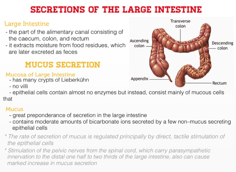 - great preponderance of secretion in the large intestine
