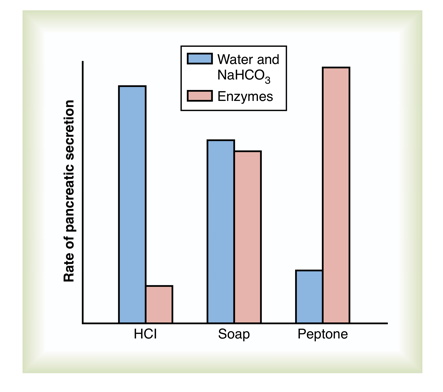3. intense digestive enzyme secretion (when peptones enter the duodenum) stimulated by cholecystokinin