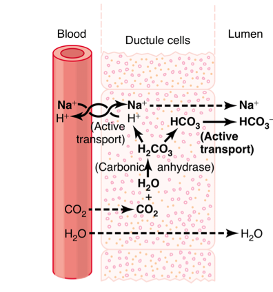 The Basic steps in the cellular mechanism for secreting sodium bicarbonate solution into the pancreatic ductules and ducts are following: