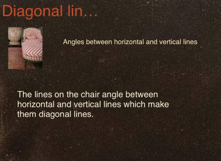 The lines on the chair angle between horizontal and vertical lines which make them diagonal lines.