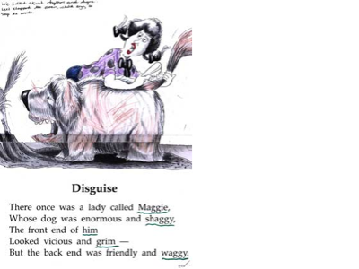 Examples:There once was a lady called Maggie,Whose dog was enormous and shaggy, The front end of him looked vicious and grim-but in the back end was friendly and waggy.