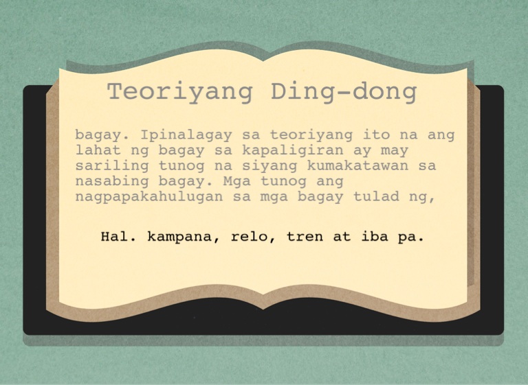bagay. Ipinalagay sa teoriyang ito na ang lahat ng bagay sa kapaligiran ay may sariling tunog na siyang kumakatawan sa nasabing bagay. Mga tunog ang nagpapakahulugan sa mga bagay tulad ng,
