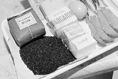 Tray_containing_a_ration_book_and_the_weekly_ration_of_sugar,_tea,_margarine,_'national_butter',_lard,_eggs,_bacon_and_cheese_as_issued_to_an_adult_in_Britain_during_1942._D79