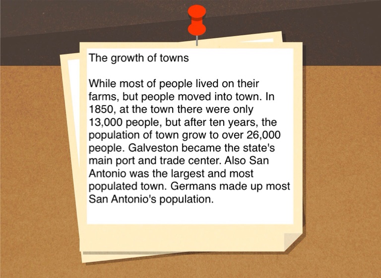 While most of people lived on their farms, but people moved into town. In 1850, at the town there were only 13,000 people, but after ten years, the population of town grow to over 26,000 people. Galveston became the state's main port and trade center. Also San Antonio was the largest and most populated town. Germans made up most San Antonio's population.