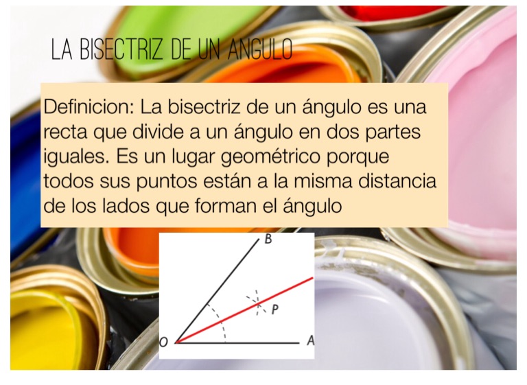 Definicion: La bisectriz de un ángulo es una recta que divide a un ángulo en dos partes iguales. Es un lugar geométrico porque todos sus puntos están a la misma distancia de los lados que forman el ángulo