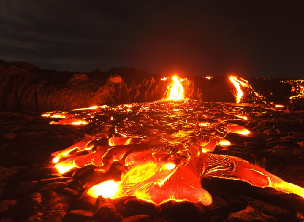 A mountain or hill, typically conical, having a crater or vent through which lava, rock fragments, hot vapor, and gas are being or have been erupted from the earth's crust.