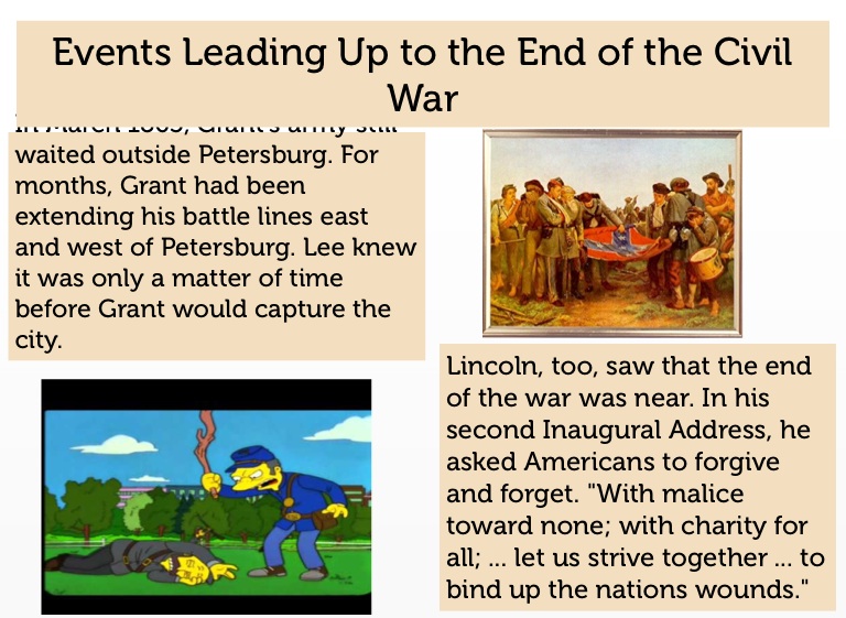 Lincoln, too, saw that the end of the war was near. In his second Inaugural Address, he asked Americans to forgive and forget. "With malice toward none; with charity for all; ... let us strive together ... to bind up the nations wounds."