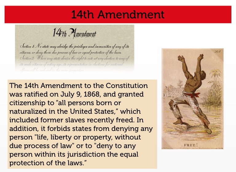 The 14th Amendment to the Constitution was ratified on July 9, 1868, and granted citizenship to “all persons born or naturalized in the United States,” which included former slaves recently freed. In addition, it forbids states from denying any person "life, liberty or property, without due process of law" or to "deny to any person within its jurisdiction the equal protection of the laws.”
