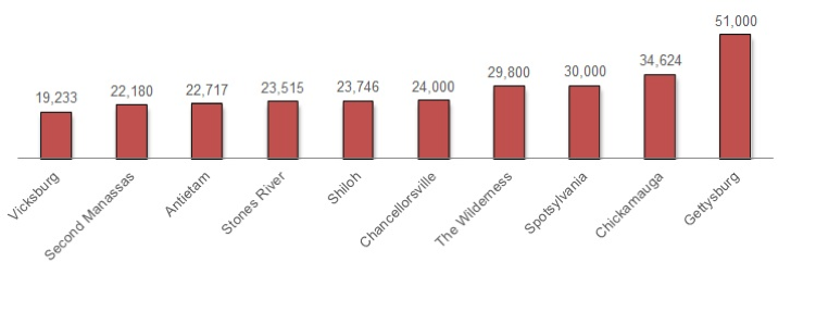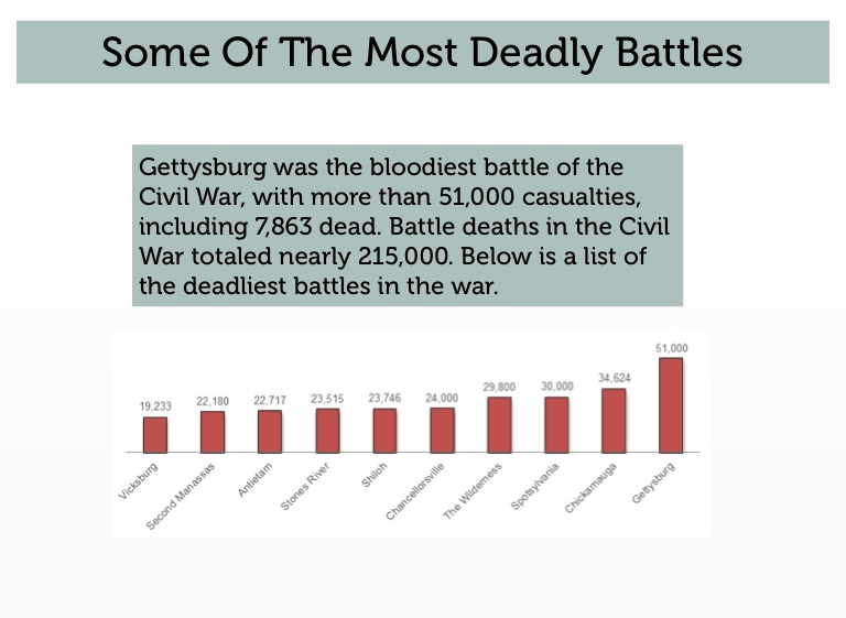 Gettysburg was the bloodiest battle of the Civil War, with more than 51,000 casualties, including 7,863 dead. Battle deaths in the Civil War totaled nearly 215,000. Below is a list of the deadliest battles in the war.