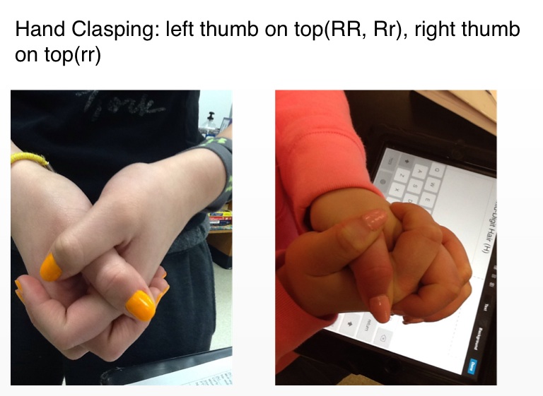Hand Clasping: left thumb on top(RR, Rr), right thumb on top(rr)