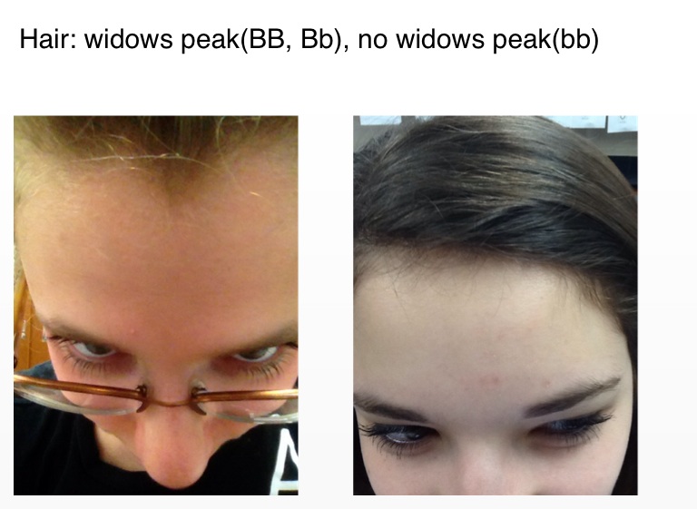 Hair: widows peak(BB, Bb), no widows peak(bb)