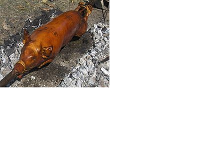 Nosotros comemos el lechón, arroz con gandules, y mofogo