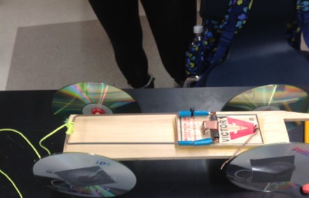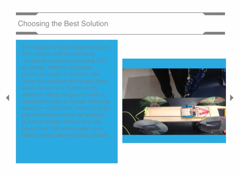 We thought our best solution was our third solution with the car being completely horizontal and using CDs as wheels, with the mousetrap positioned nearer to the front. We chose this because we thought there would be less of a chance of the extension hitting the ground when it reached the front of the car. Since the extension wouldn't hit, there would be less of a chance of the car stopping due to unneeded friction. Also, we figured that CDs would make much better wheels than the plastic wheels.
