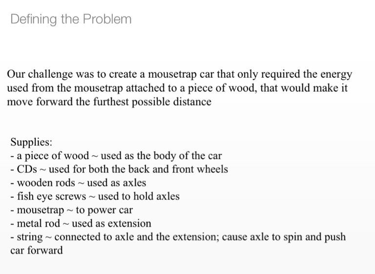 Our challenge was to create a mousetrap car that only required the energy used from the mousetrap attached to a piece of wood, that would make it move forward the furthest possible distance