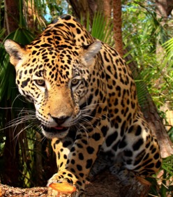 Jaguars have several adaptations that allow them to be one of the most successful creatures in the tropical rainforests. Firstly, jaguars have jaws and a large head equipped for piercing the skull of their prey with their canines. Unlike every other large cat, who attack at the neck, jaguars often kill their prey with a single bite to the back of the head. As the jaguar is extremely fast, together their attack method, their sharp teeth and claws, and their speed the jaguar is an unstoppable force on the forest floor. Another adaptation jaguars have is that they are primarily nocturnal, with high activity levels at dusk and dawn when the majority of the tropical rainforest species would be asleep. Another adaptation jaguars posses is the fact they are exceptional swimmers. Because tropical rainforests are usually full of flooded swamp areas, this adaptation comes in handy when they are trying to catch food or simply cool off. Jaguars also have a unique spotted pattern called rosettes which consists of a spot within a spot. This creates a phenomenal source of camouflage for the jaguar. Lastly, the jaguar has a long tail which keeps them balances when they are running, making sharp turns, and climbing, three uncommon things for a jaguar to do in the forest. Jaguars also have rough padded paws to help add traction when running and climbing.