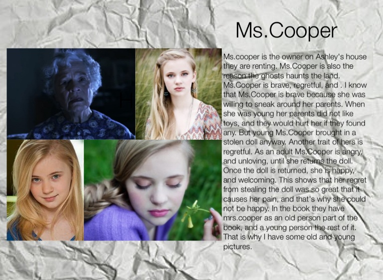 Ms.cooper is the owner on Ashley's house they are renting. Ms.Cooper is also the reason the ghosts haunts the land. Ms.Cooper is brave, regretful, and . I know that Ms.Cooper is brave because she was willing to sneak around her parents. When she was young her parents did not like toys, and they would hurt her if they found any. But young Ms.Cooper brought in a stolen doll anyway. Another trait of hers is regretful. As an adult Ms.Cooper is angry, and unloving, until she returns the doll. Once the doll is returned, she is happy, and welcoming. This shows that her regret from stealing the doll was so great that it causes her pain, and that's why she could not be happy. In the book they have mrs.cooper as an old person part of the book, and a young person the rest of it. That is why I have some old and young pictures.