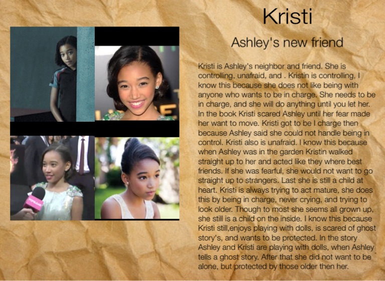 Kristi is Ashley's neighbor and friend. She is controlling, unafraid, and . Kristin is controlling, I know this because she does not like being with anyone who wants to be in charge. She needs to be in charge, and she will do anything until you let her. In the book Kristi scared Ashley until her fear made her want to move. Kristi got to be I charge then because Ashley said she could not handle being in control. Kristi also is unafraid. I know this because when Ashley was in the garden Kristin walked straight up to her and acted like they where best friends. If she was fearful, she would not want to go straight up to strangers. Last she is still a child at heart. Kristi is always trying to act mature, she does this by being in charge, never crying, and trying to look older. Though to most she seems all grown up, she still is a child on the inside. I know this because Kristi still,enjoys playing with dolls, is scared of ghost story's, and wants to be protected. In the story Ashley and Kristi are playing with dolls, when Ashley tells a ghost story. After that she did not want to be alone, but protected by those older then her.