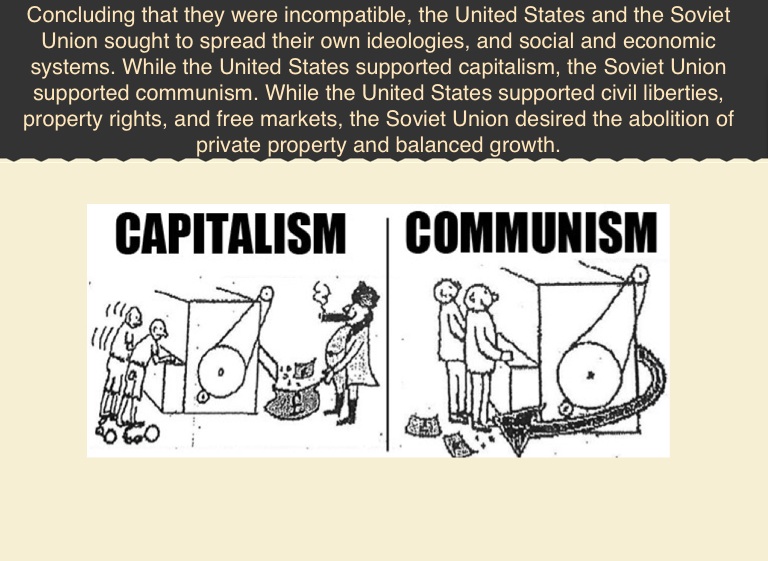 Concluding that they were incompatible, the United States and the Soviet Union sought to spread their own ideologies, and social and economic systems. While the United States supported capitalism, the Soviet Union supported communism. While the United States supported civil liberties, property rights, and free markets, the Soviet Union desired the abolition of private property and balanced growth.
