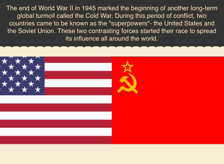 The end of World War II in 1945 marked the beginning of another long-term global turmoil called the Cold War. During this period of conflict, two countries came to be known as the "superpowers"- the United States and the Soviet Union. These two contrasting forces started their race to spread its influence all around the world.
