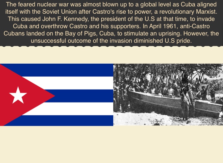The feared nuclear war was almost blown up to a global level as Cuba aligned itself with the Soviet Union after Castro's rise to power, a revolutionary Marxist. This caused John F. Kennedy, the president of the U.S at that time, to invade Cuba and overthrow Castro and his supporters. In April 1961, anti-Castro Cubans landed on the Bay of Pigs, Cuba, to stimulate an uprising. However, the unsuccessful outcome of the invasion diminished U.S pride.