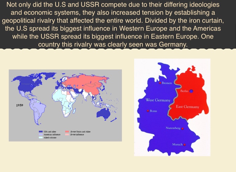 Not only did the U.S and USSR compete due to their differing ideologies and economic systems, they also increased tension by establishing a geopolitical rivalry that affected the entire world. Divided by the iron curtain, the U.S spread its biggest influence in Western Europe and the Americas while the USSR spread its biggest influence in Eastern Europe. One country this rivalry was clearly seen was Germany.