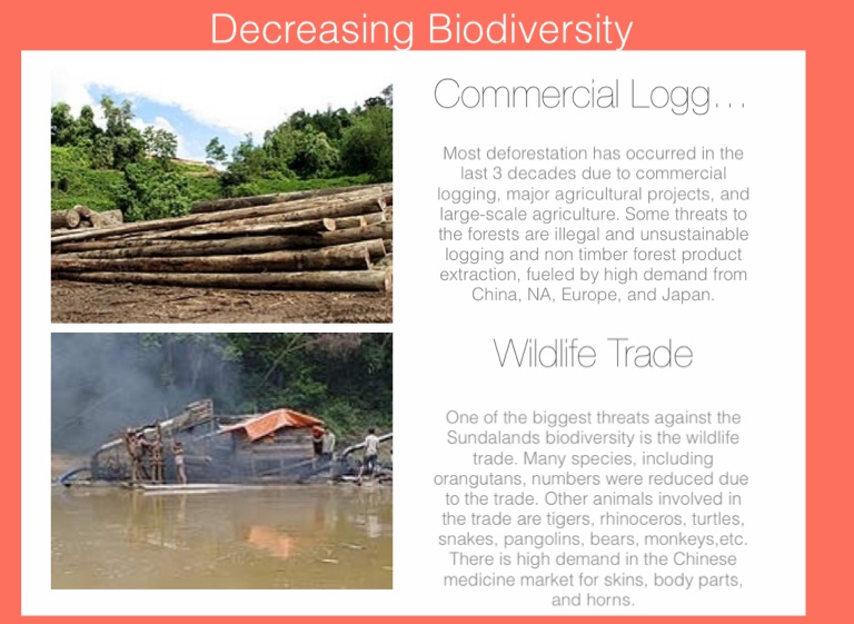 One of the biggest threats against the Sundalands biodiversity is the wildlife trade. Many species, including orangutans, numbers were reduced due to the trade. Other animals involved in the trade are tigers, rhinoceros, turtles, snakes, pangolins, bears, monkeys,etc. There is high demand in the Chinese medicine market for skins, body parts, and horns.
