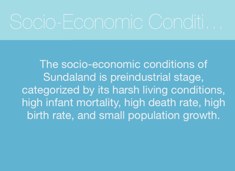 The socio-economic conditions of Sundaland is preindustrial stage, categorized by its harsh living conditions, high infant mortality, high death rate, high birth rate, and small population growth.