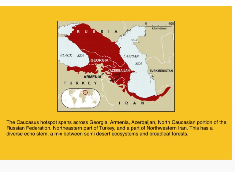 The Caucasus hotspot spans across Georgia, Armenia, Azerbaijan, North Caucasian portion of the Russian Federation. Northeastern part of Turkey, and a part of Northwestern Iran. This has a diverse echo stem, a mix between semi desert ecosystems and broadleaf forests.