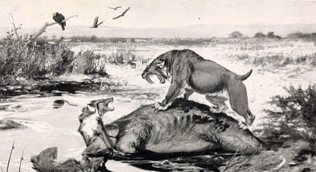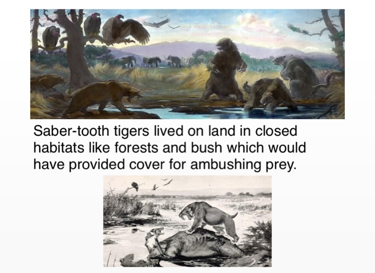 Saber-tooth tigers lived on land in closed habitats like forests and bush which would have provided cover for ambushing prey.