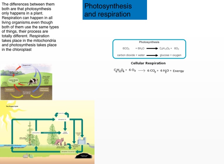 The differences between them both are that photosynthesis only happens in a plant. Respiration can happen in all living organisms.even though both of them use the same types of things, their process are totally different. Respiration takes place in the mitochondria and photosynthesis takes place in the chloroplast