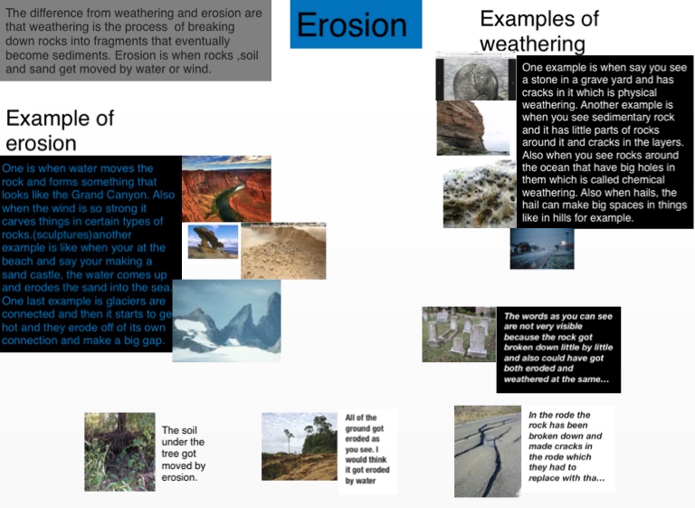 The difference from weathering and erosion are that weathering is the process of breaking down rocks into fragments that eventually become sediments. Erosion is when rocks ,soil and sand get moved by water or wind.