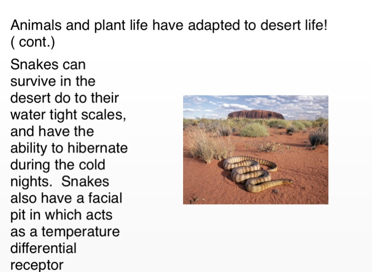Snakes can survive in the desert do to their water tight scales, and have the ability to hibernate during the cold nights. Snakes also have a facial pit in which acts as a temperature differential receptor
