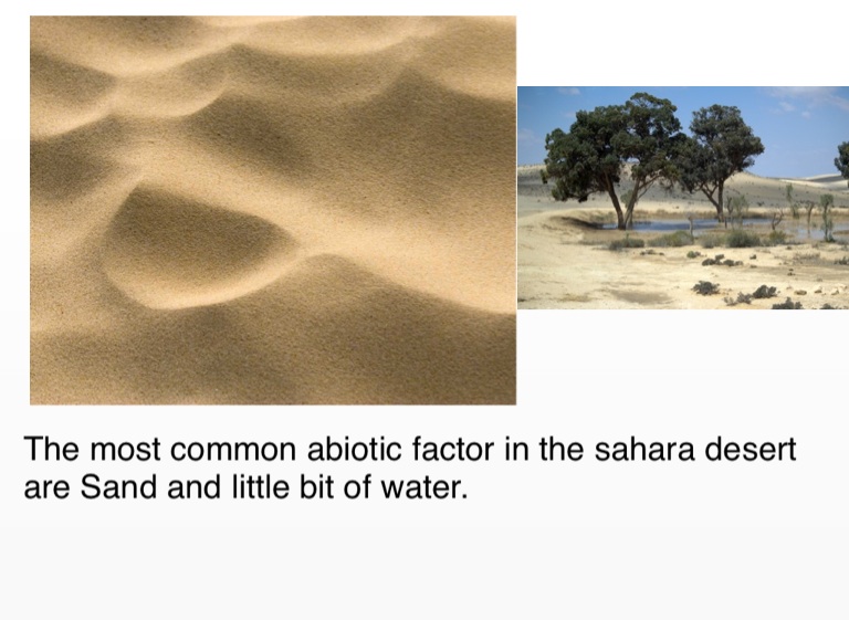 The most common abiotic factor in the sahara desert are Sand and little bit of water.