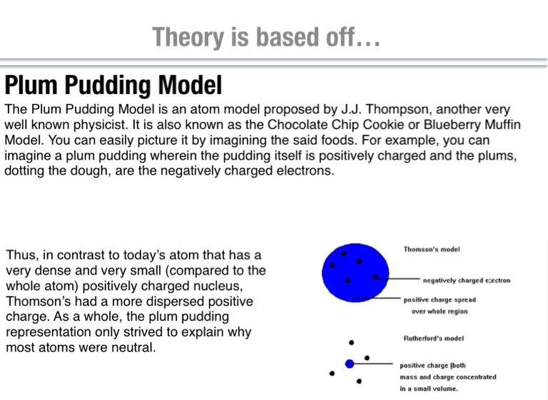 The Plum Pudding Model is an atom model proposed by J.J. Thompson, another very well known physicist. It is also known as the Chocolate Chip Cookie or Blueberry Muffin Model. You can easily picture it by imagining the said foods. For example, you can imagine a plum pudding wherein the pudding itself is positively charged and the plums, dotting the dough, are the negatively charged electrons.