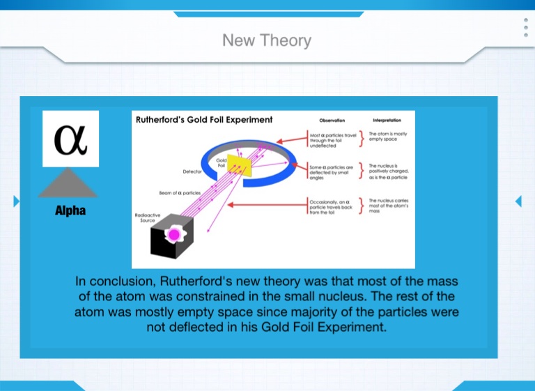In conclusion, Rutherford's new theory was that most of the mass of the atom was constrained in the small nucleus. The rest of the atom was mostly empty space since majority of the particles were not deflected in his Gold Foil Experiment.