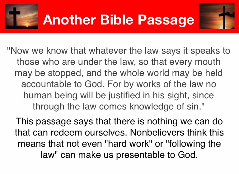 This passage says that there is nothing we can do that can redeem ourselves. Nonbelievers think this means that not even "hard work" or "following the law" can make us presentable to God.