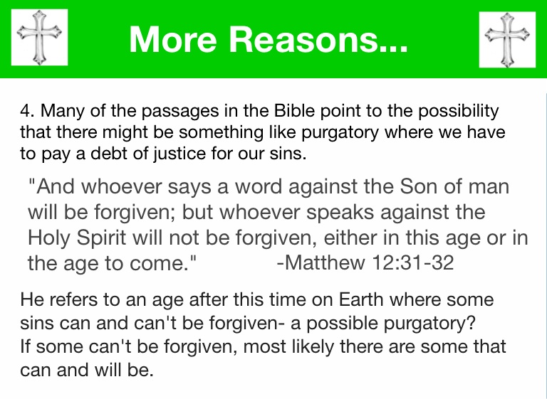 4. Many of the passages in the Bible point to the possibility that there might be something like purgatory where we have to pay a debt of justice for our sins.