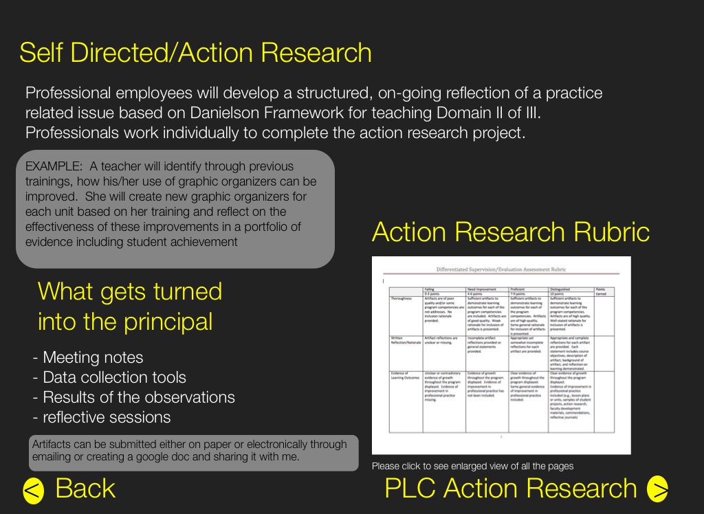 Professional employees will develop a structured, on-going reflection of a practice related issue based on Danielson Framework for teaching Domain II of III. Professionals work individually to complete the action research project.