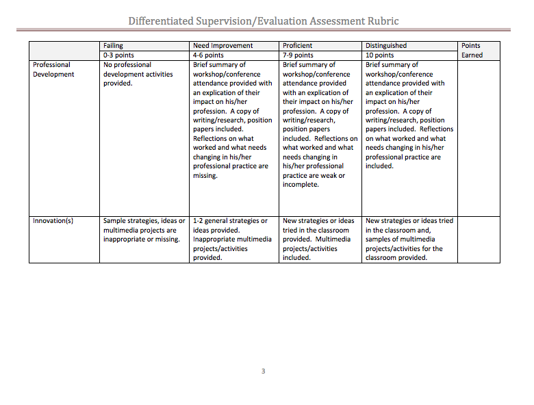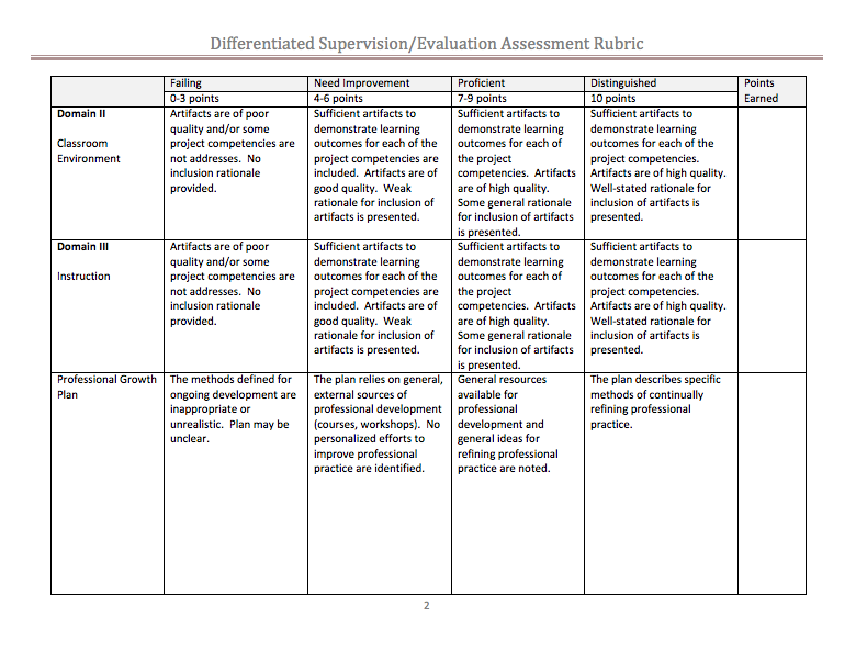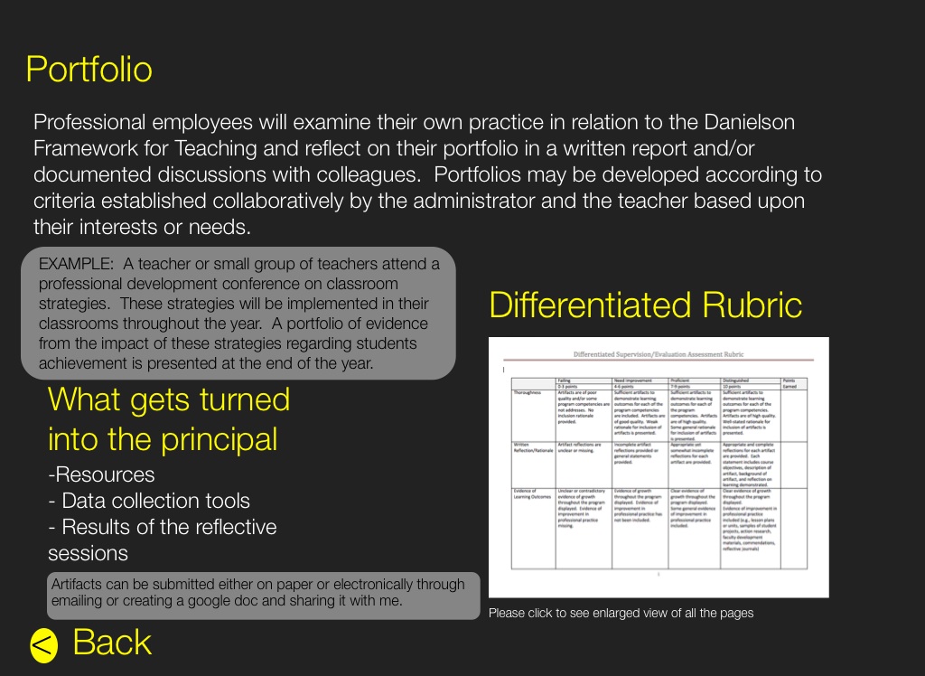 Professional employees will examine their own practice in relation to the Danielson Framework for Teaching and reflect on their portfolio in a written report and/or documented discussions with colleagues. Portfolios may be developed according to criteria established collaboratively by the administrator and the teacher based upon their interests or needs.