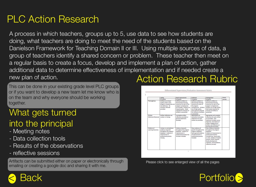 A process in which teachers, groups up to 5, use data to see how students are doing, what teachers are doing to meet the need of the students based on the Danielson Framework for Teaching Domain II or III. Using multiple sources of data, a group of teachers identify a shared concern or problem. These teacher then meet on a regular basis to create a focus, develop and implement a plan of action, gather additional data to determine effectiveness of implementation and if needed create a new plan of action.